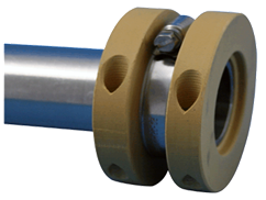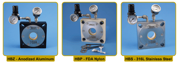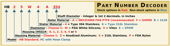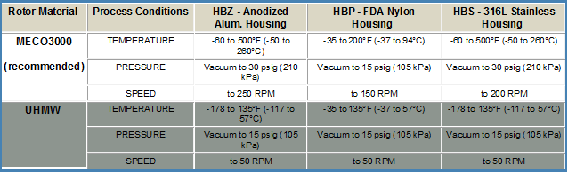 The HB seal’s rugged housing options are designed for long life. You may choose from three stock housing materials: FDA Nylon, Anodized Aluminum or 316L SS. Three elastomer materials, Viton, FDA white silicone or EPDM, ensure compatibility with nearly all applications. The standard stators are type 304 stainless steel. The standard rotors are MECO3000, a high-performance, bearing grade, -polymer-filled PTFE with FDA approval. No abrasive filler material is added to MECO3000. MECO3120, a white, FDA approved, ceramic filled, PTFE is available as an option for processes where maximum wear resistance is needed. UHMW Polyethylene is available as a low-cost option for non-abrasive applications or processes where PTFE is not permitted.