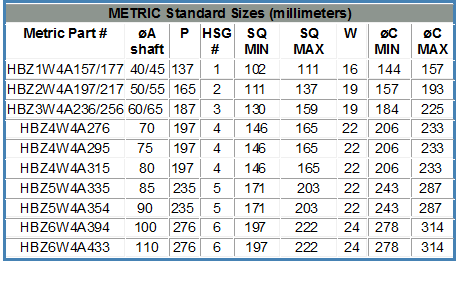 The HB model seal is stocked in 7 ¬standard inch and 13 metric sizes. These 20 seals can be easily converted for other shaft sizes and all fit within the 6 stocked housing (HSG) sizes. This allows the HB model seals to be sized for shaft diameters 5.07" (129mm) and smaller. See the Stocked HSG# Chart below for maximum shaft size for each of the seven housings. HBZ0 size is not available in the HC format or with the FDA Nylon housing, or with split internal parts.